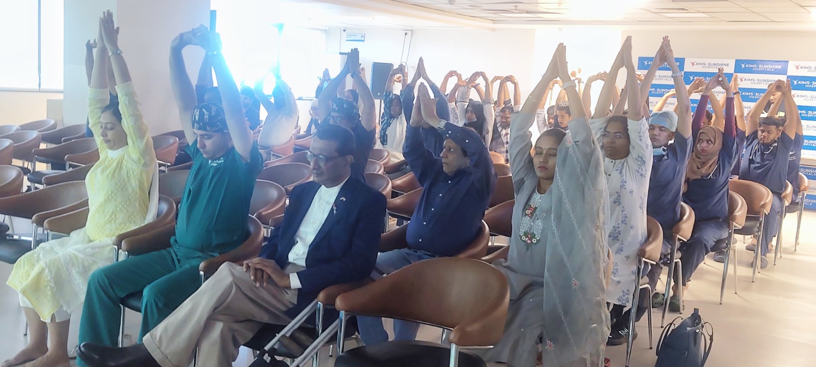 KIMS-SUNSHINE Hospitals hosted a revitalising wellness session on the occasion of International Self Care Day. The yoga session was led by Mrs. Kartyeeni Ankush, a Certified Yoga Therapist, Ayurvedic Nutritionist and Face Yoga Expert. The session focused on integrating Face Yoga, Meditation and Pranayamam into our daily routines for better mental clarity, emotional resilience and physical well-being. Doctors, residents and hospital staff of KIMS-SUNSHINE Hospitals, Begumpet participated in the morning session, which combined mindful breathing techniques, practical stress-relief tools and interactive yoga demonstrations. The event was a reminder that in healthcare, self-care is not optional, it is an essential necessity.