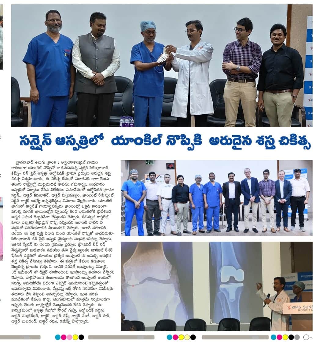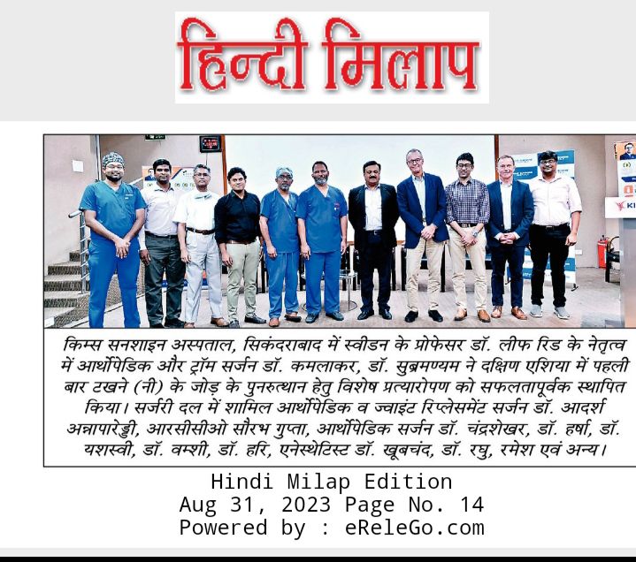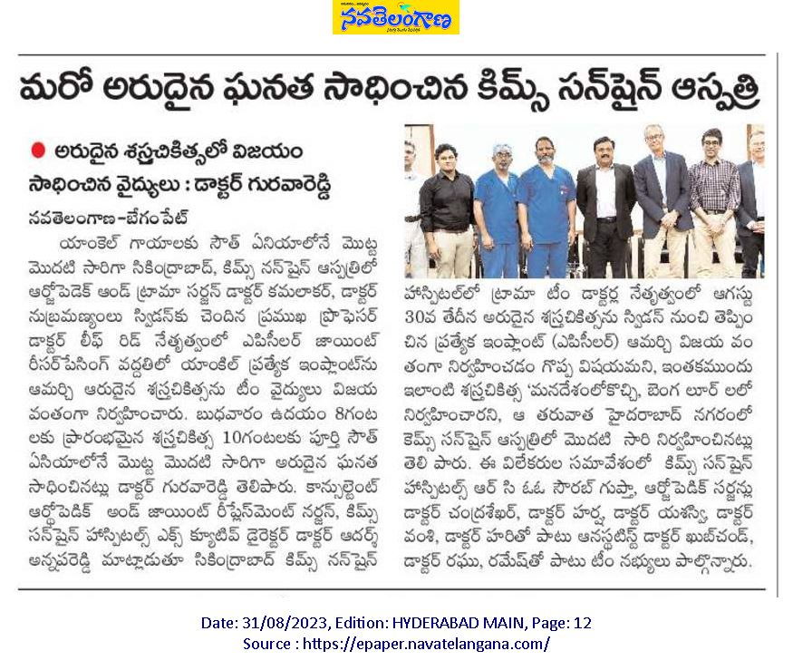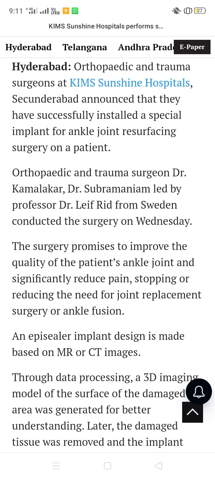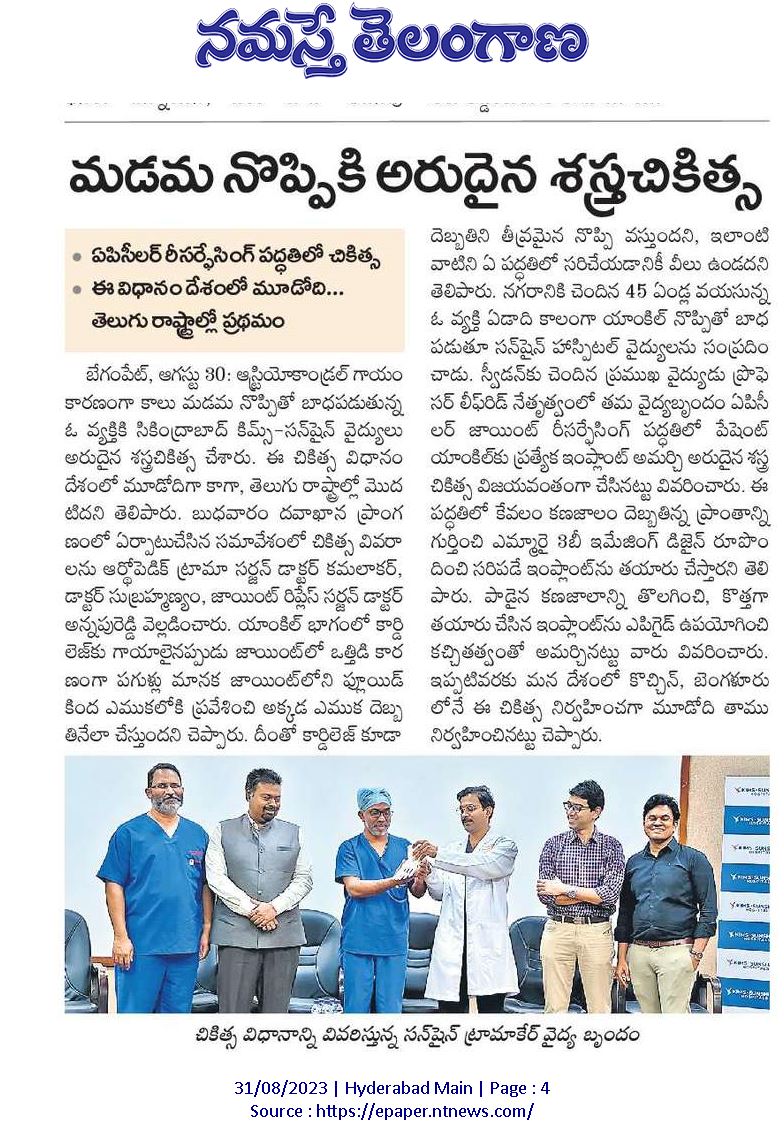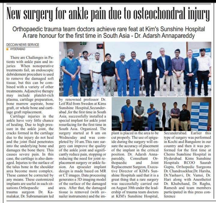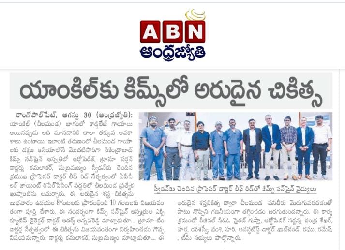 KIMS-Sunshine Hospitals performed a successful “Ankle Joint Resurfacing with a Special Implant” procedure at the hospital. It is the first successful orthopaedic procedure done in South Asia. The procedure was successfully performed by orthopaedic and trauma surgeon, Dr. Kamalakar, Dr. Subramaniam and led by professor Dr. Leif Rid from Sweden. procedure was conducted on Wednesday at the hospital.