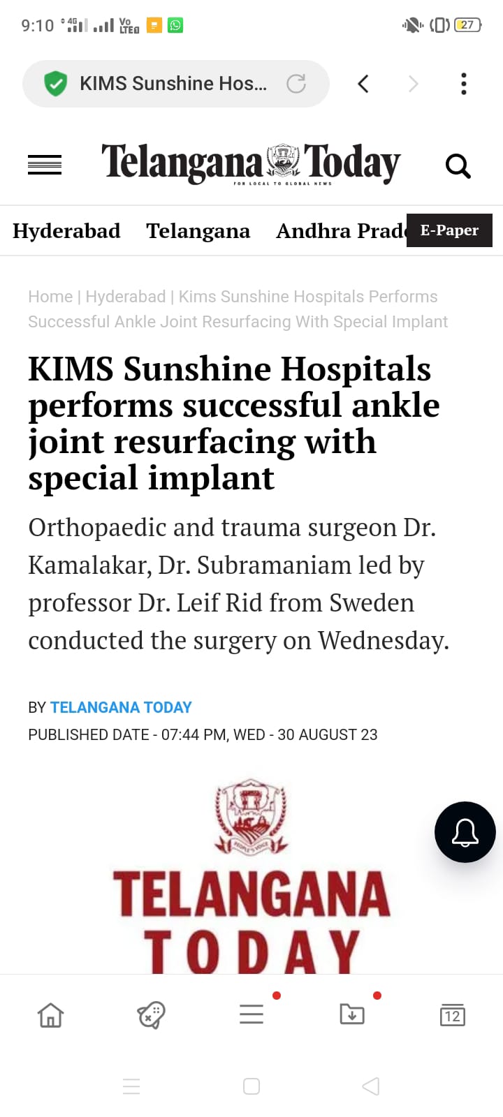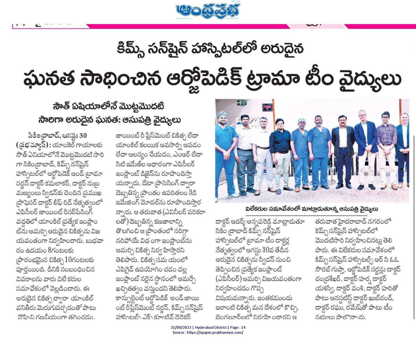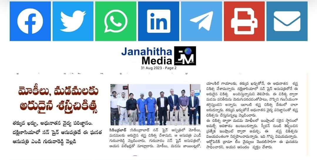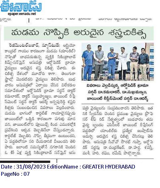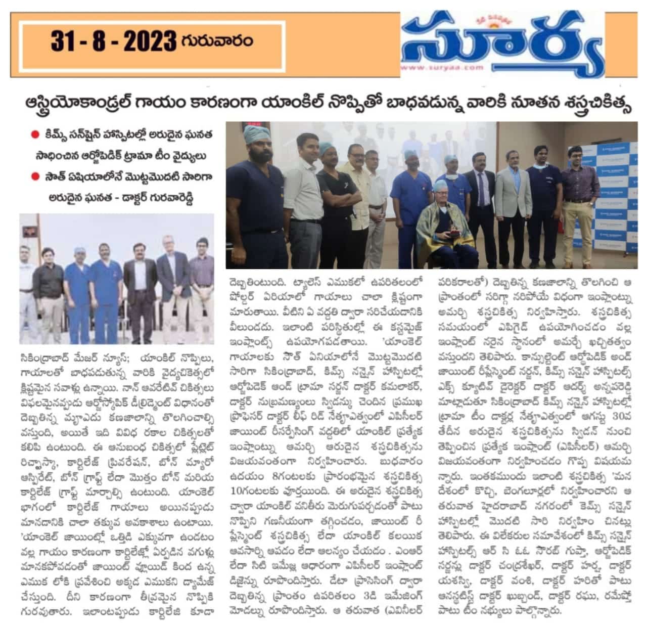 KIMS-Sunshine Hospitals performed a successful “Ankle Joint Resurfacing with a Special Implant” procedure at the hospital. It is the first successful orthopaedic procedure done in South Asia. The procedure was successfully performed by orthopaedic and trauma surgeon, Dr. Kamalakar, Dr. Subramaniam and led by professor Dr. Leif Rid from Sweden. procedure was conducted on Wednesday at the hospital.