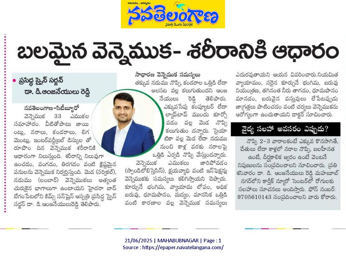 Dr. D. Anjaneyulu Reddy Featured in Navatelangana for Raising Spine Health Awareness