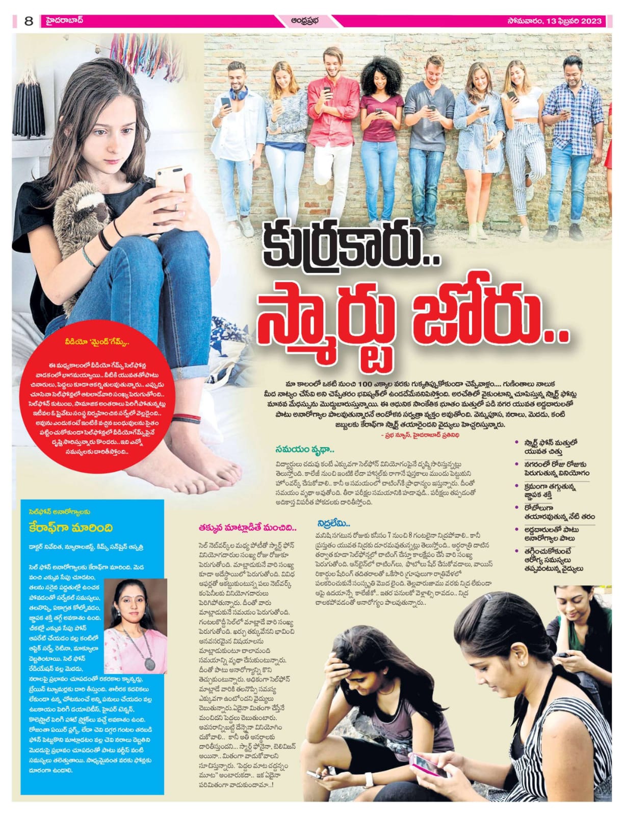 March 1, 2023 news కుర్రకారు.. స్మారు జోరు.. ll Dr Niveditha – Consultant Neuropthysician, KIMS SUNSHINE Hospitals, Secunderabad -How mobile phone radiations impact our brain activity – Andhra Prabha Telugu Daily Newspaper By hospital_support 0 0