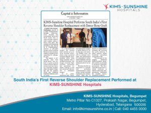 South India’s First Reverse Shoulder Replacement Performed at KIMS-SUNSHINE Hospitals We have successfully performed South India’s first reverse shoulder replacement at KIMS-SUNSHINE Hospitals, Begumpet using a donor bone graft. The patient, a 27-year-old man from South Africa, had suffered a severe shoulder fracture with massive bone loss due to a traumatic accident. The complex surgery was led by our expert shoulder surgeon, Dr. B. Chandrasekhar, Director of Shoulder Surgery at Sunshine Bone & Joint Institute, along with his expert team. The procedure involved restoring joint stability and shoulder movement using an advanced